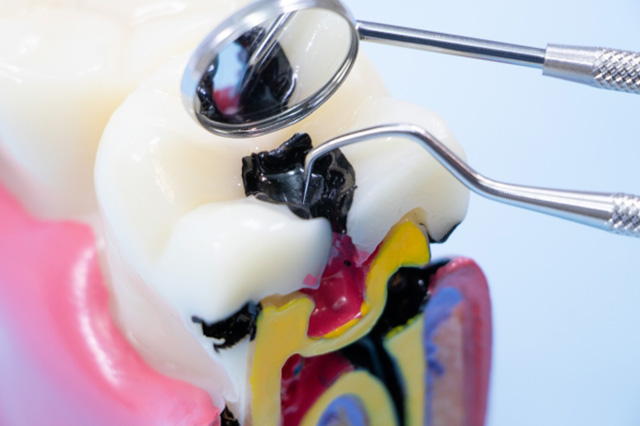 虫歯は、口の中の細菌が出す酸によって歯が溶かされていく病気です。初期段階では痛みがほとんどありませんが、進行すると痛みやしみる症状が現れ、治療が必要になります。